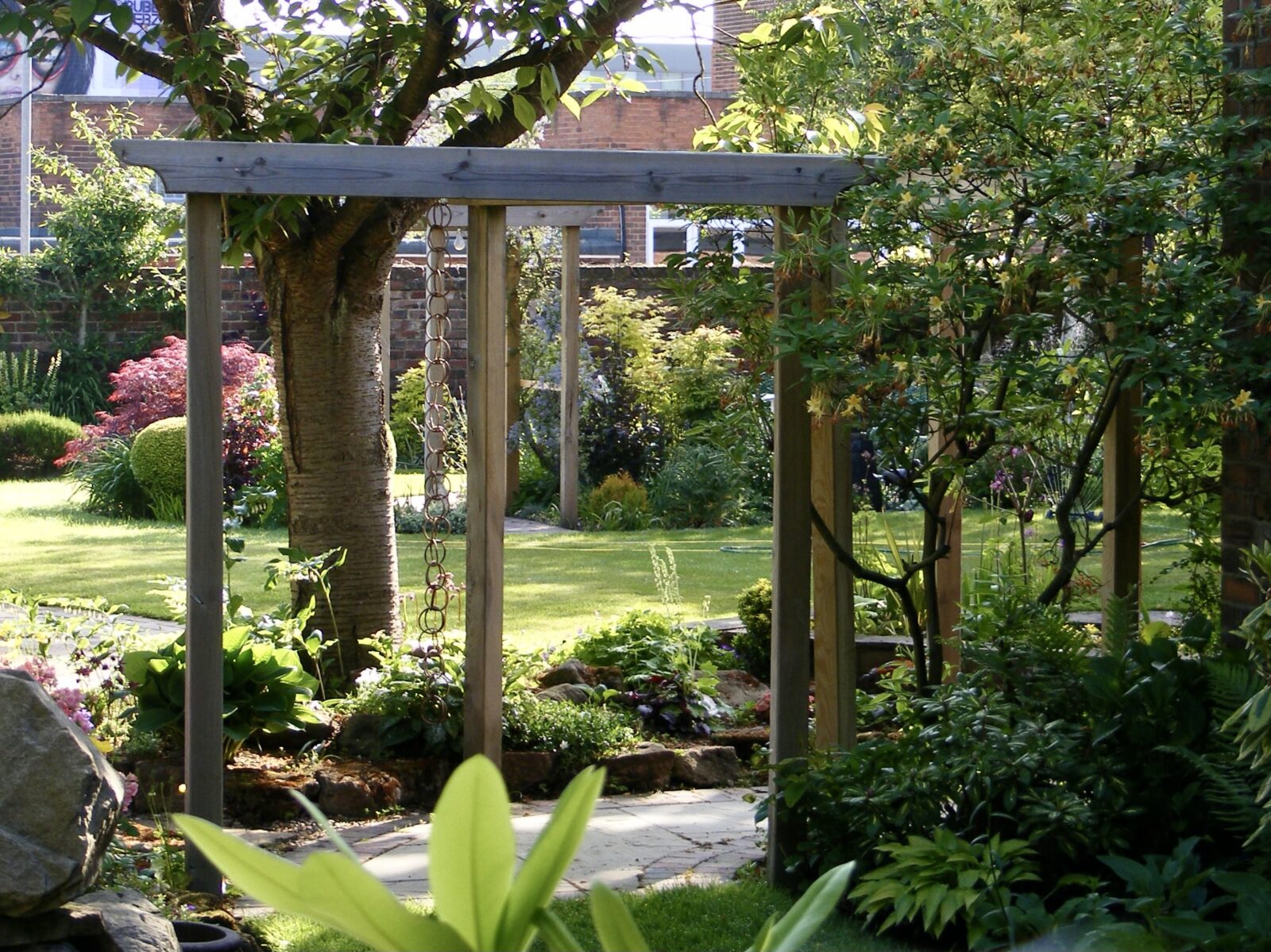 We have been developing our town centre garden for nearly 50 years. In this our Diamond Wedding Anniversary year, we welcome visitors again to enjoy its summer glories—mature lawns, flowering beds, sculptured artefacts and a new arbor.