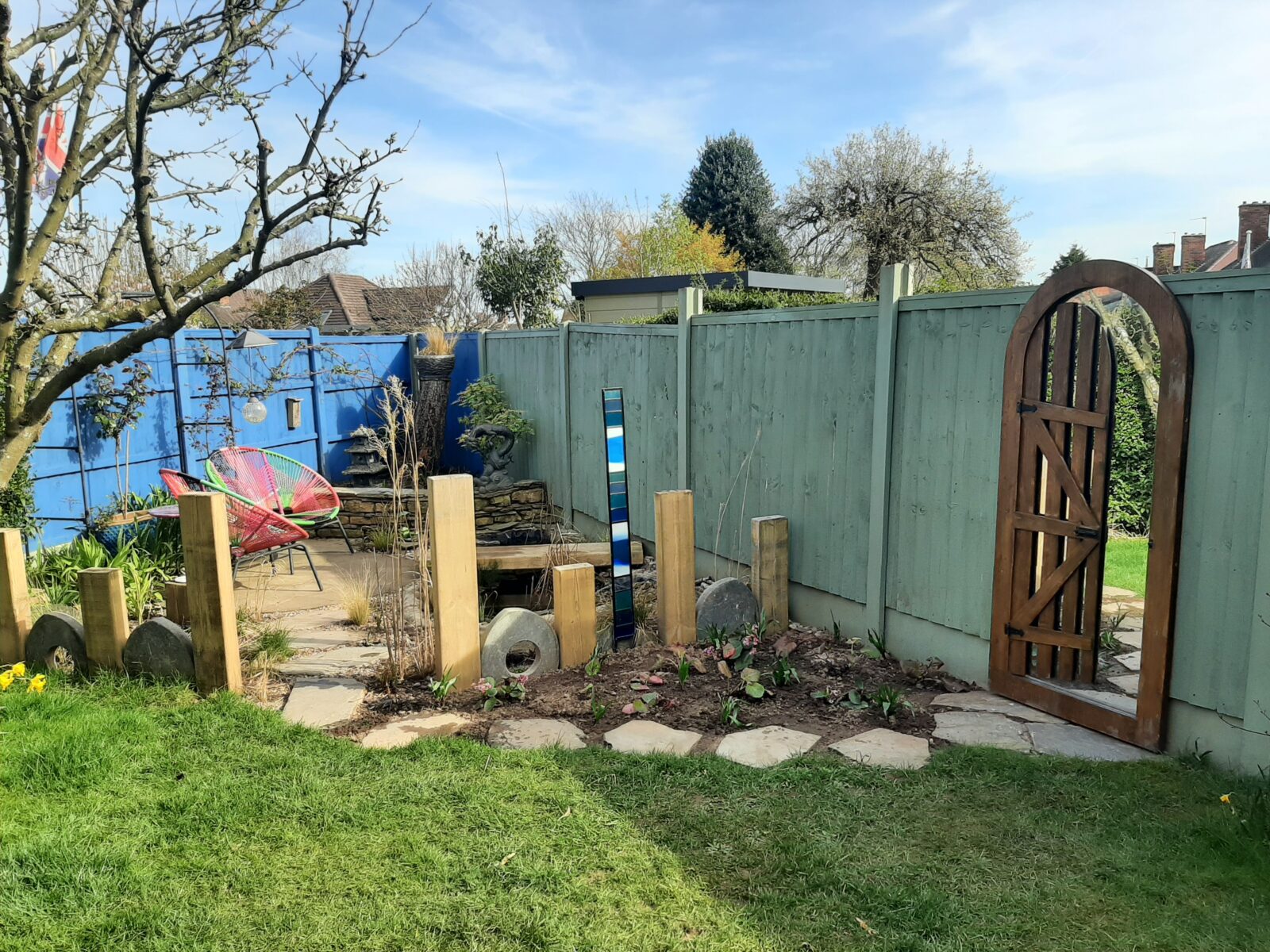 There are six distinct areas: A wildflower meadow surrounded by fruit trees, a stumpery/fernery, an outdoor room with raised goldfish pond, a South-facing mixed bed with fruit bushes, a rose arch and new this year: a wildlife pond surrounded by grasses and stepping stones leading to a magic gate. All interspersed with art and sculptures. If you look closely enough you may see some fairies and even find a dragon’s nest with hatchling.