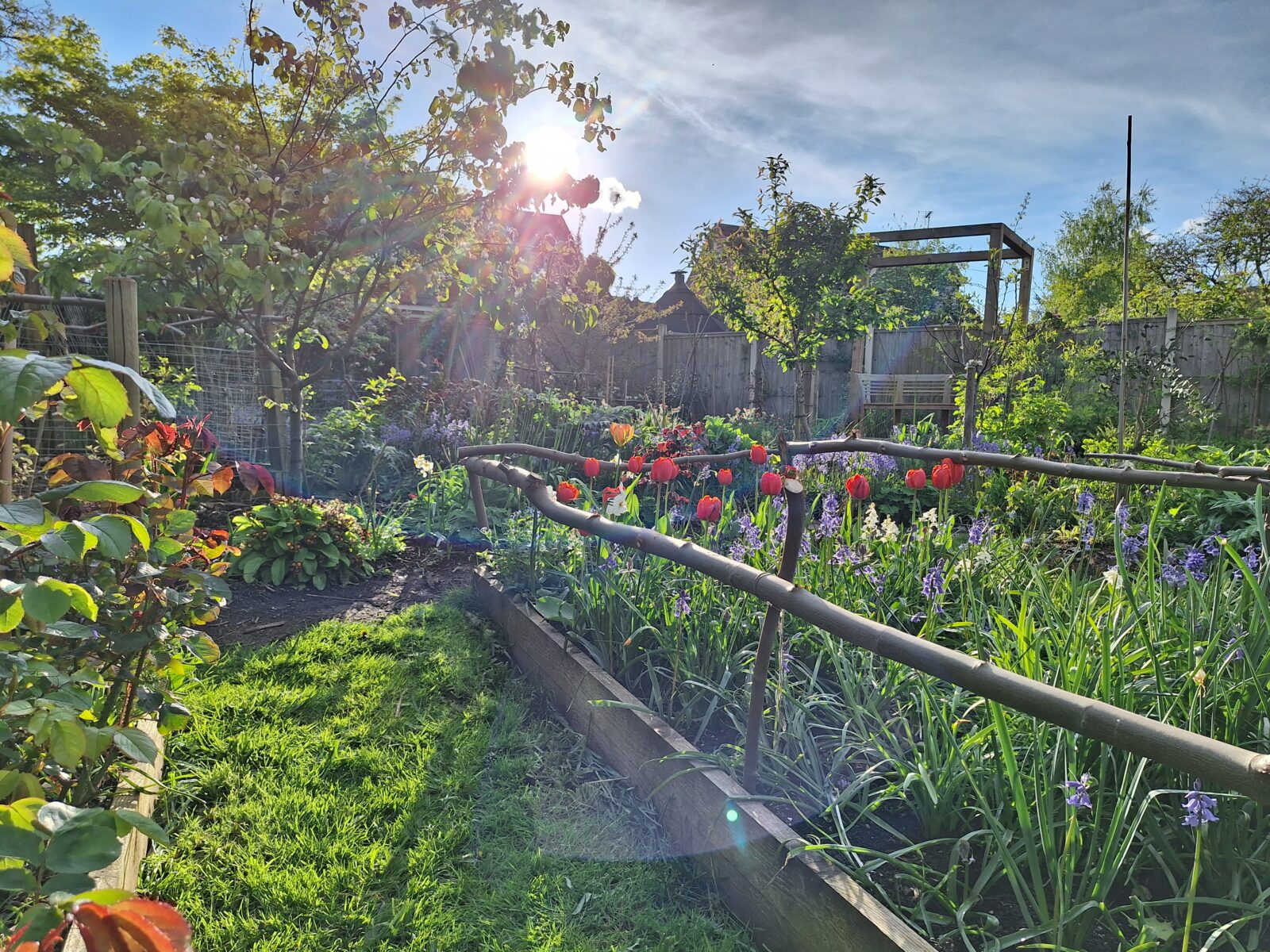 The garden is inspired by permaculture principles, and creating a space where wildlife can thrive. There are also great examples of recycling and reusing, including a greenhouse made from reclaimed windows and eight rescued ex-battery chickens!